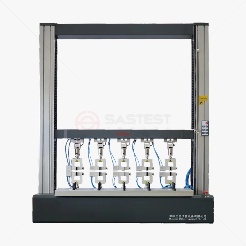 微機控制多工位電子萬能拉伸試驗機用于塑料、橡膠、皮革等各種非金屬材料及小金屬材料等產品試樣的拉伸試驗,配有5個氣動夾具,可進行單獨控制,也可同時進行五條試樣的拉伸試樣,大大提高試驗效率,采用進口電機及伺服控制系統和進口傳感器,并配備全閉環測量控制系統,可實現力控、變形控、位移控等多種控制方式自動切換;自有國內試驗機行業功能軟件系統,自動實時生成圖線和各種表格,自動計算延伸率、抗拉強度、抗壓強度、屈服強度、彈性模量等各種參數并有英文版軟件,可以執行GB、ISO、ASTM、DIN、JIS、CE等各種檢測標準。