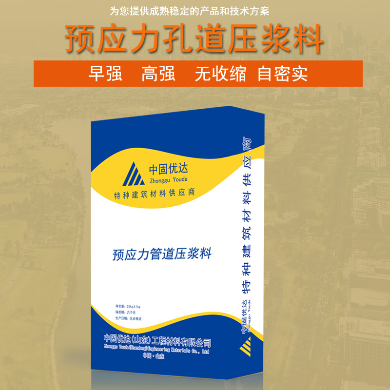 預(yù)應(yīng)力管道壓漿料簡稱壓漿料,是由優(yōu)質(zhì)水泥基材料、減水劑、微膨脹劑、礦物摻合料配制而成,具有良好的流動性,不泌水,不離析,無收縮、微膨脹,強度高,抗?jié)B抗凍、抗腐蝕、粘接度高、綠色環(huán)保等特點,不含氧化物、氯化物、亞硫酸鹽和亞硝酸鹽等對鋼筋有害組份,產(chǎn)品廣泛應(yīng)用于鐵路橋梁、公路橋梁、核電站等大型工程的預(yù)應(yīng)力結(jié)構(gòu)孔道灌漿的施工;各種砼結(jié)構(gòu)接頭處止漏灌漿;空隙填補或修復(fù);地面錨固壓漿、設(shè)備基礎(chǔ)壓漿、底板注漿、梁柱節(jié)點、工程搶修等用途。